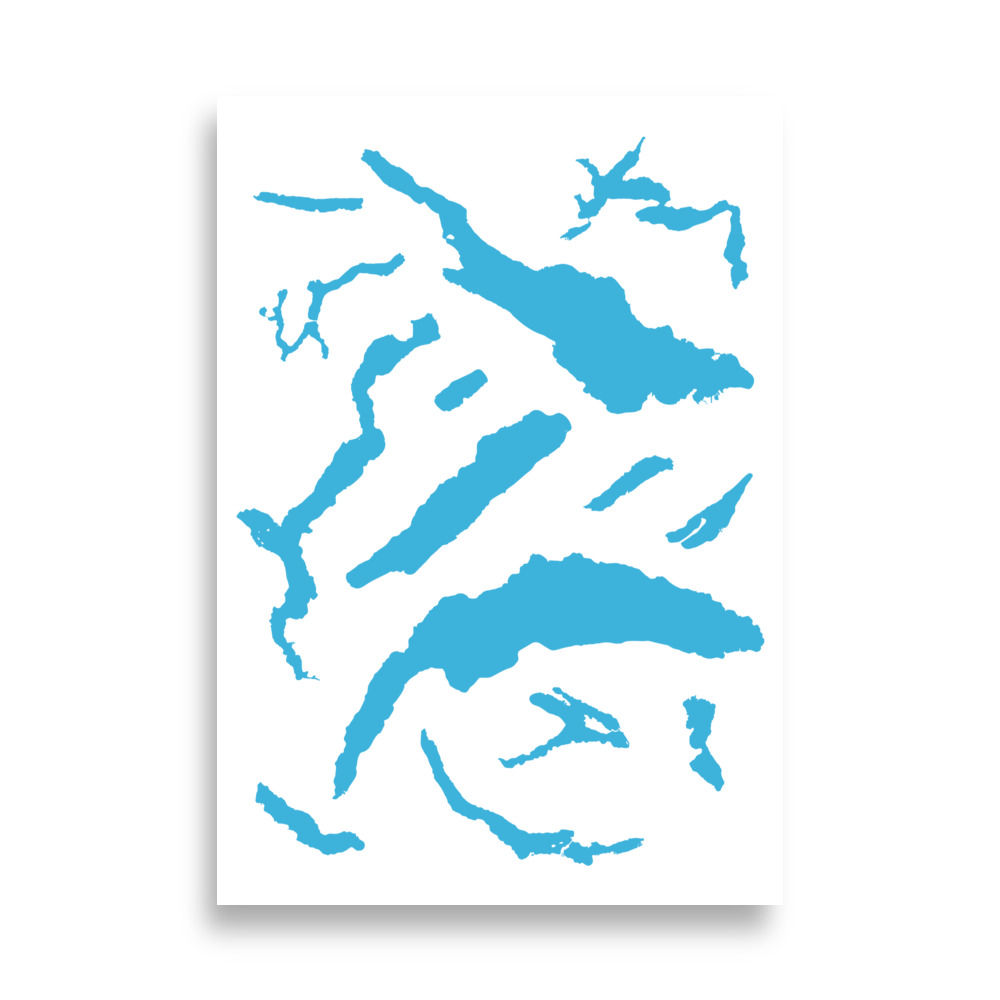 The lakes in Switzerland are beyond beautiful. I wanted to make a print about them, and after exploring their shapes, the idea of this camouflage-like form of the largest lakes of Switzerland was born.