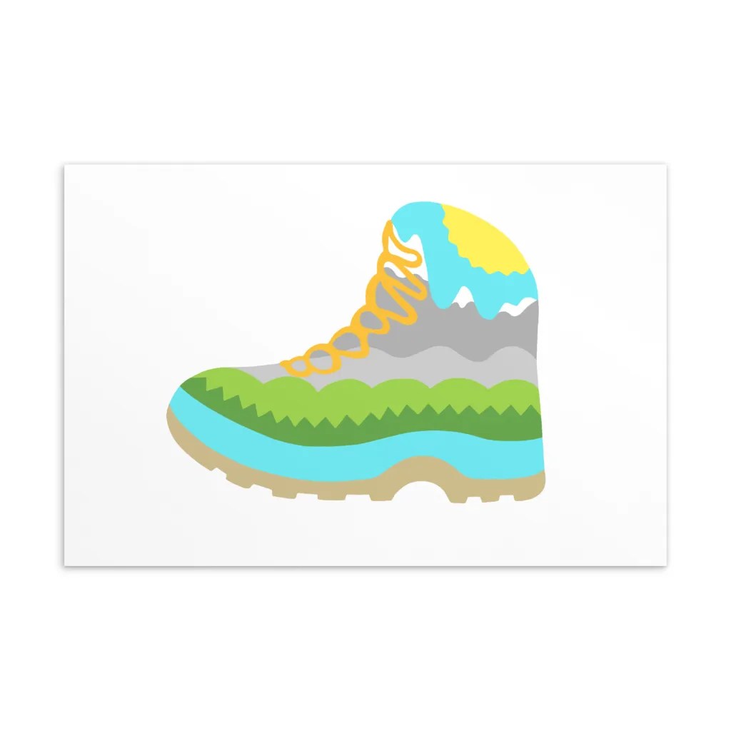 This print was originally created to be a postage stamp, yet its destiny has been to appear on bigger things such as totes and wall prints. Like a real hiking boot, it works in many sizes and platforms, bringing the outdoors with it where ever it goes.